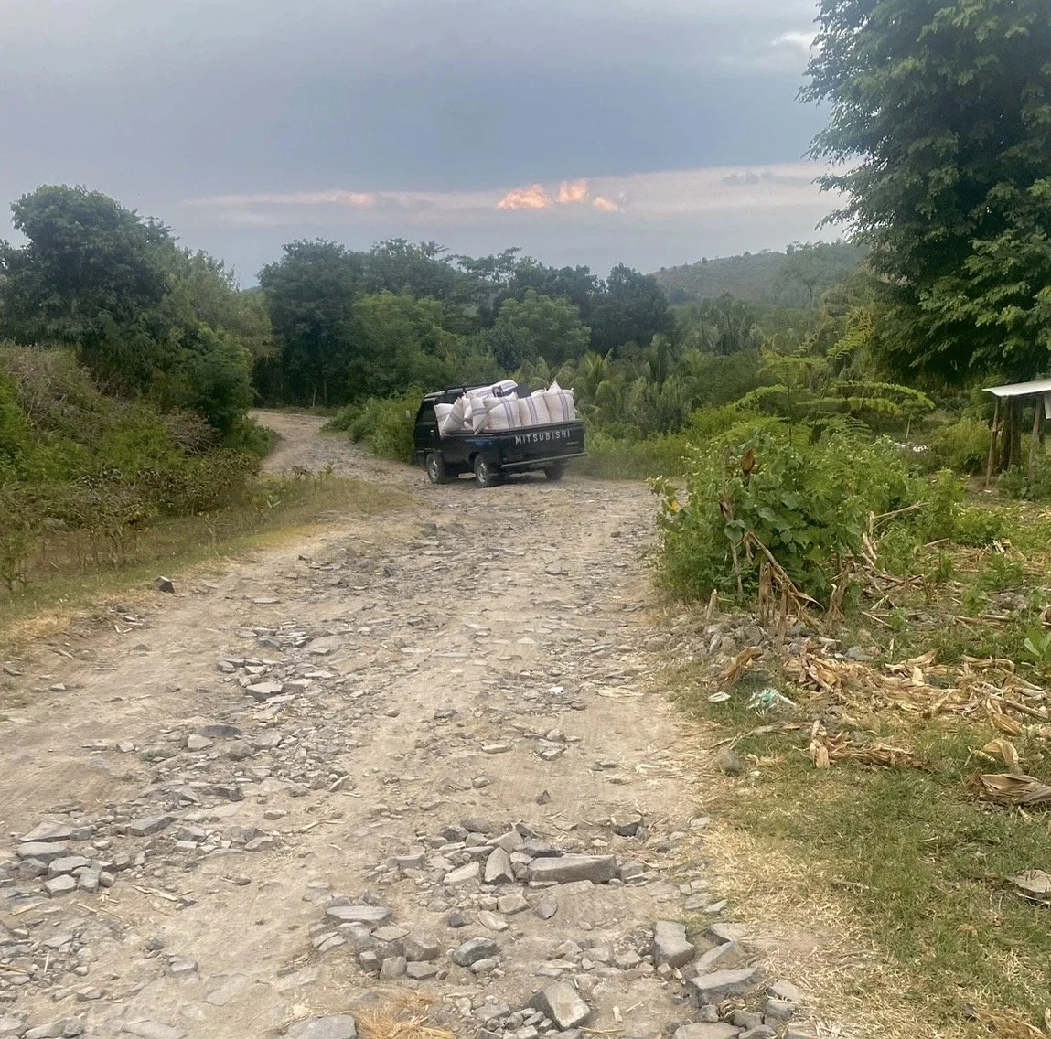 I began my drive along the southern coastal road, which winds in and out of tropical mountains and crystal clear coves. For three hours I skirted around muddy potholes and ditches, ascended up and over mountains, and took in the serene views around me. At points I'd be chased by laughing village kids, amused at my inability to steer around the potholes without falling over. On another stretch I had to drive on the side of the road as a farming family had taken up an entire stretch of it to dry their corn out on the pavement.