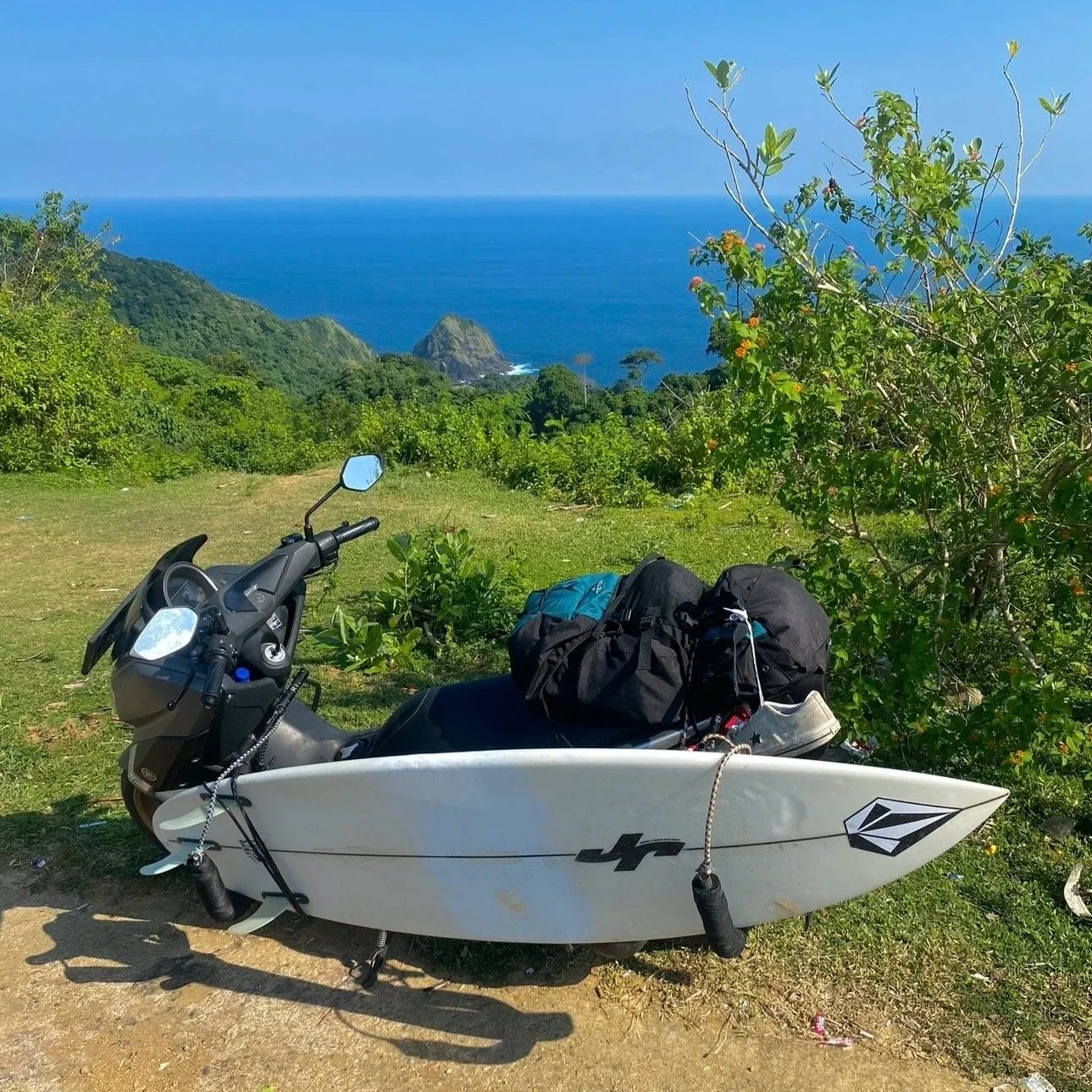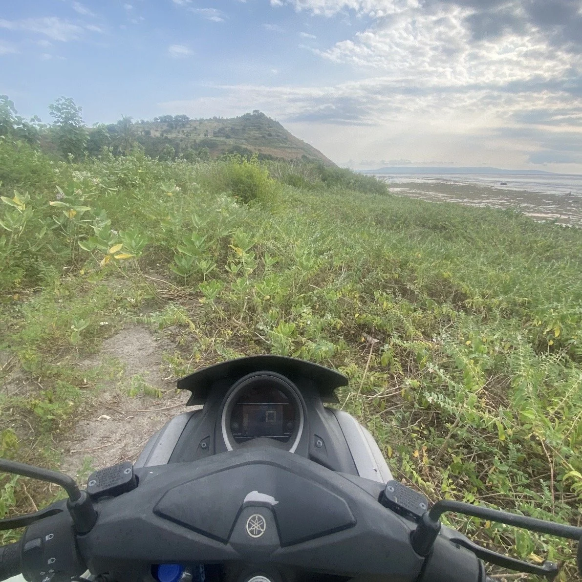 I gave up on Jamaica lodge and set out only to find the prize of my journey, Desert Point. With the swell expecting to fade out by morning, I just wanted to lay eyes on it. Without any more service, I just started guessing where Desert Point would be. I assumed it would be behind the evident mountain towering over the village so I took the sand path heading towards the beach. Huge portions had holes filled in with eaten corn. I tried to floor it through the corn and again fell off my bike and scraped my knees up pretty good. I kept on the path until it really just fizzled into nothing but tall grass and my bike was stuck deep in the loose sand.