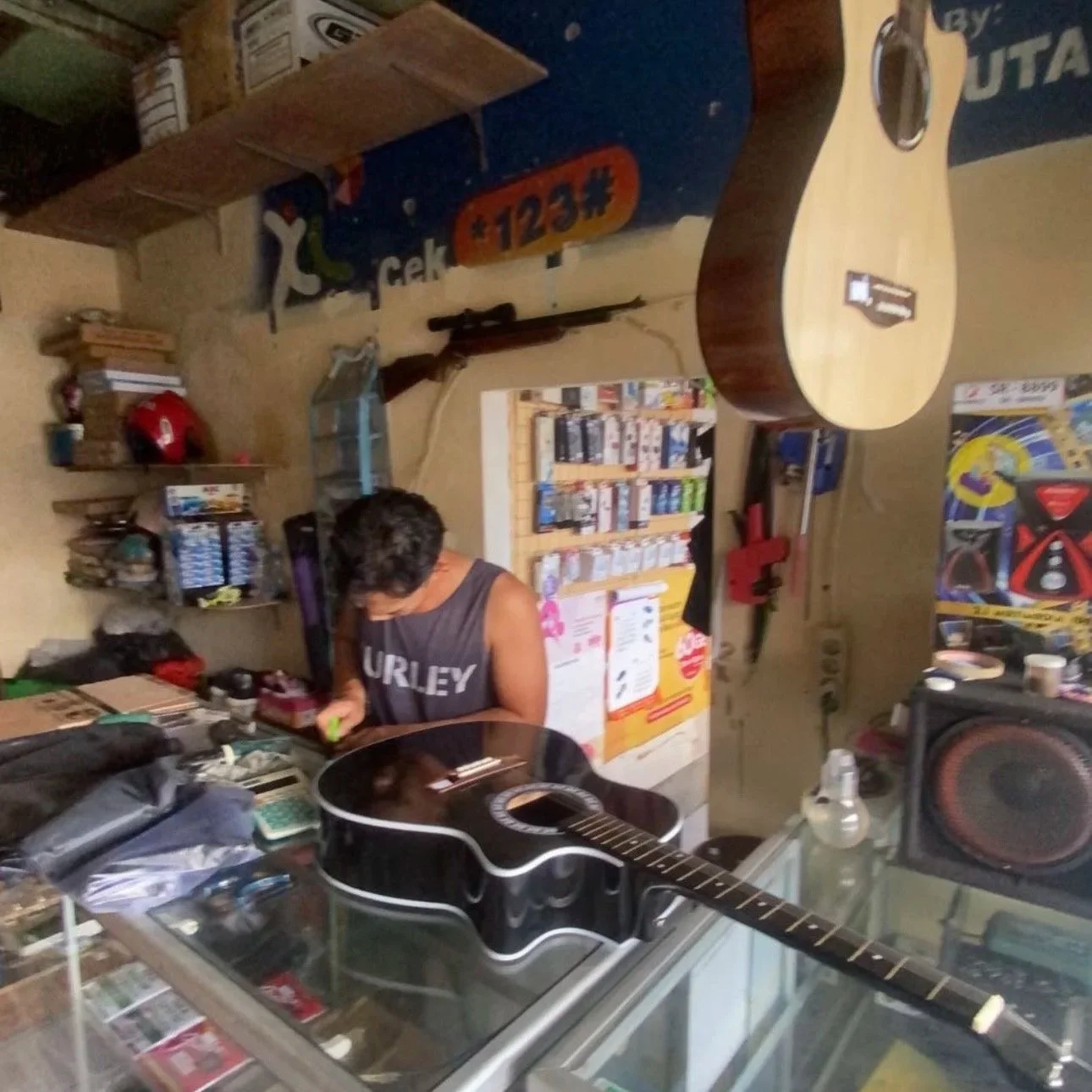 As a twenty year old solo tripping through Indonesia, I neglected to do any research whatsoever. I quickly realized the way of the land upon arriving in Bali and it took me about half a day to realize it wasn’t for me. The constant babbling of massages, drugs, and tours in Kuta and Denpasar was enough to send me down to Uluwatu where I found an array of vegan cafes with western prices and hundreds of people paddling for the same wave. I had to get out of this paradise hellscape. After renting a motorbike I headed up the east coast and searched for a guitar shop. I finally found one down a Denpasar back alley and after an initial fright upon finding the owner asleep with a World War Two era sniper rifle, I left the urban sprawl with a bike and shitty guitar.