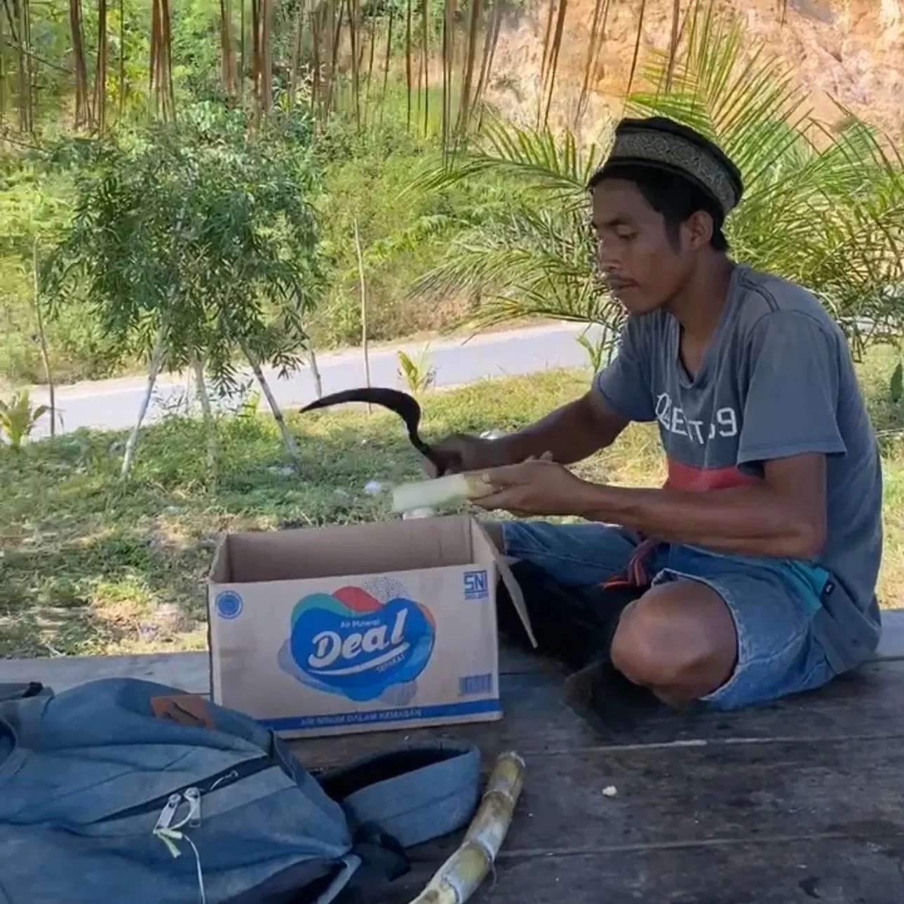 As I stopped at a hut overlooking a perfect right and left point break setup for some food and water, I had not seen a person for about an hour. I heard the bikes coming towards me with two people on each one, machetes in hand. My heart sank and since it was too quick for me to get on my bike, I just hoped for the best. They rode up to me and using their machetes to communicate they pointed to a cluster of trees. I just nodded my head, our two parties unable to understand each other. In seconds, one of the men climbed up a tree and whacked off some sugar cane for the group. In silence we shared the sweet snack and boost of energy. Moments later I was back on my way.