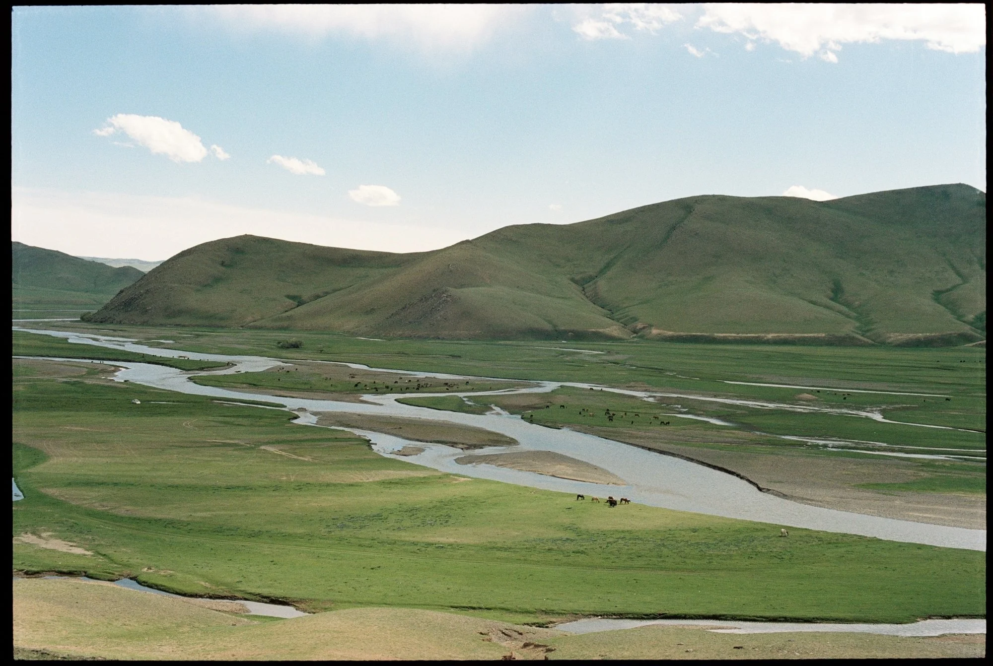 One evening I walked through the village of Kharkhorin until I reached the hill with the Russian–Mongolian Friendship Monument. From there the land opened up on the other side of the hill, revealing the winding streams of the Orkhon River below. A herd of