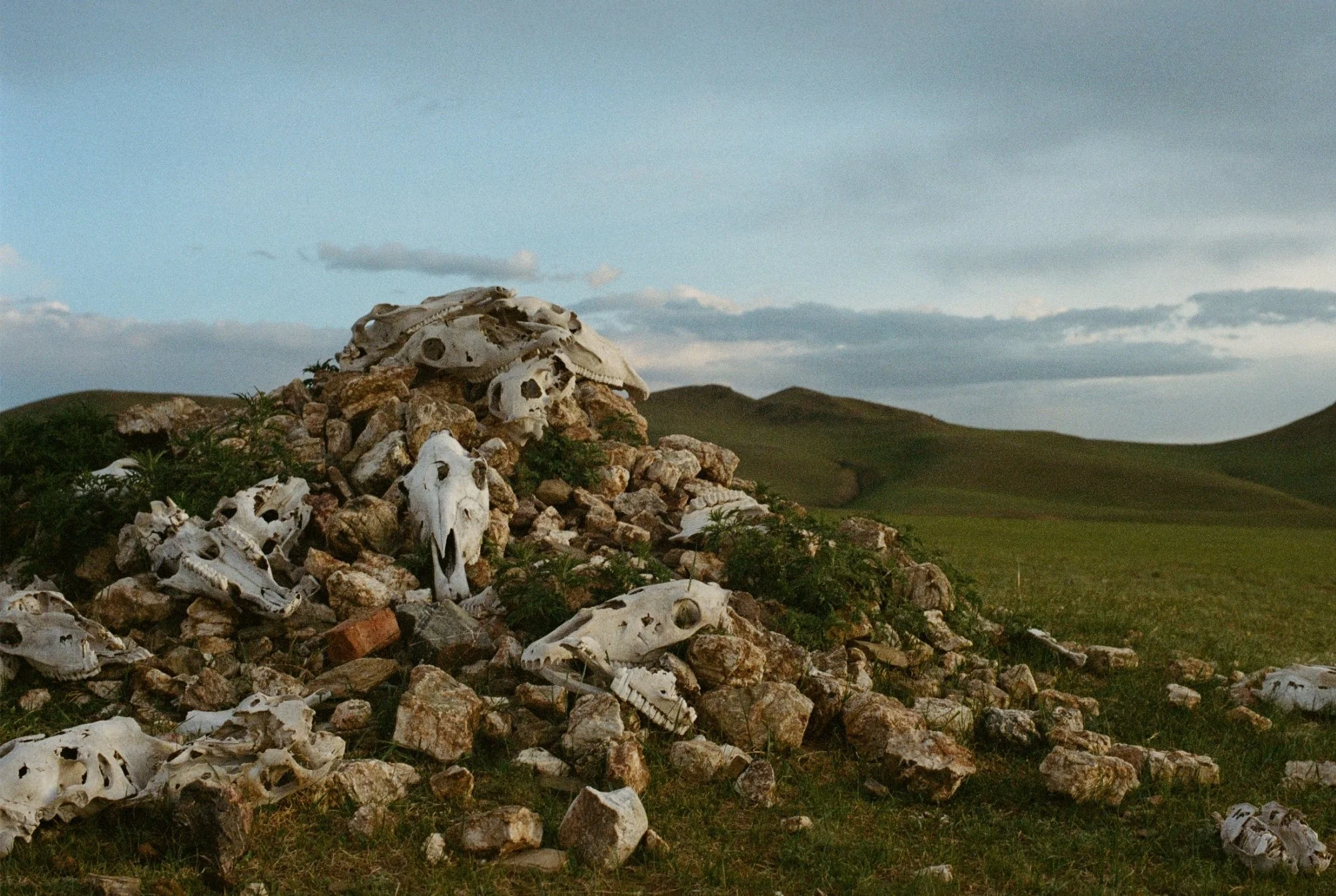 On my way back to the ger, on the outskirts of the village, I noticed something pale in the grass. As I approached, the shapes slowly became clearer. It was a mound of horse and cattle skulls resting among the stones, bleached white by the sun. Grass had begun to grow between the bones.