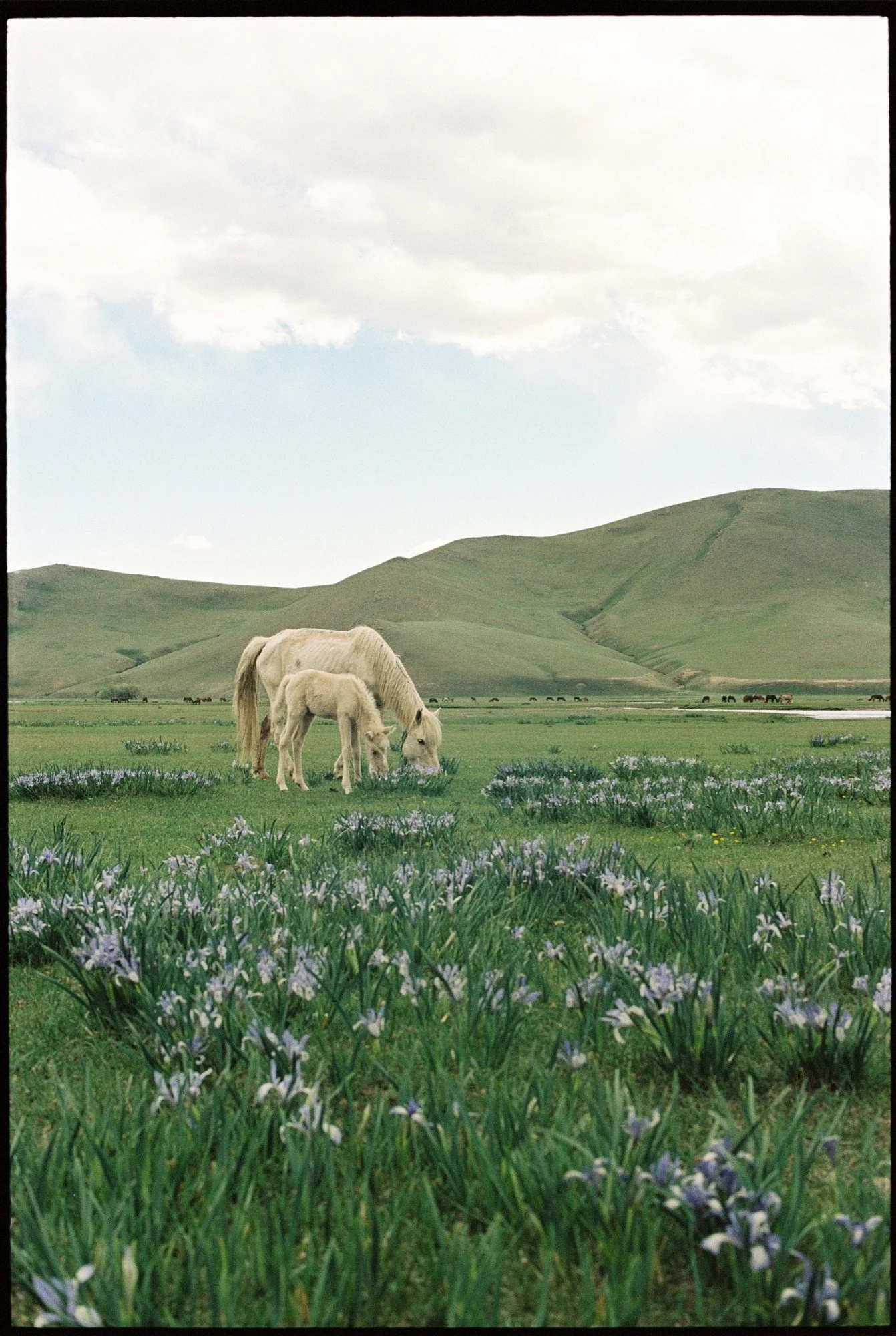 horses was grazing peacefully in the grass. Some of them are truly wild, others belong to nomadic families who let them graze freely without fences. When I walked down the slope and stepped over a small stream I suddenly found myself closer to the herd than expected. The horses were curious but kept their distance. Between the wild irises blooming across the meadow stood a mare with her foal. I took a photograph and then turned back toward the hill.