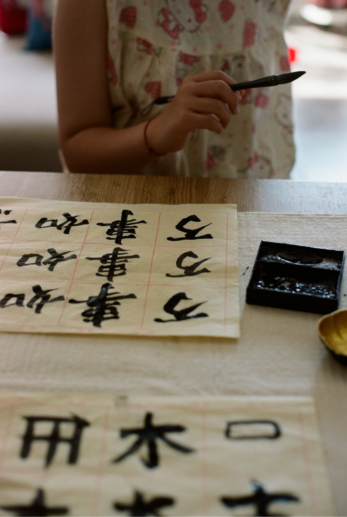 “This one means luck,” she says. I let my brush glide slowly across the page, repeating the lines until the paper is filled.